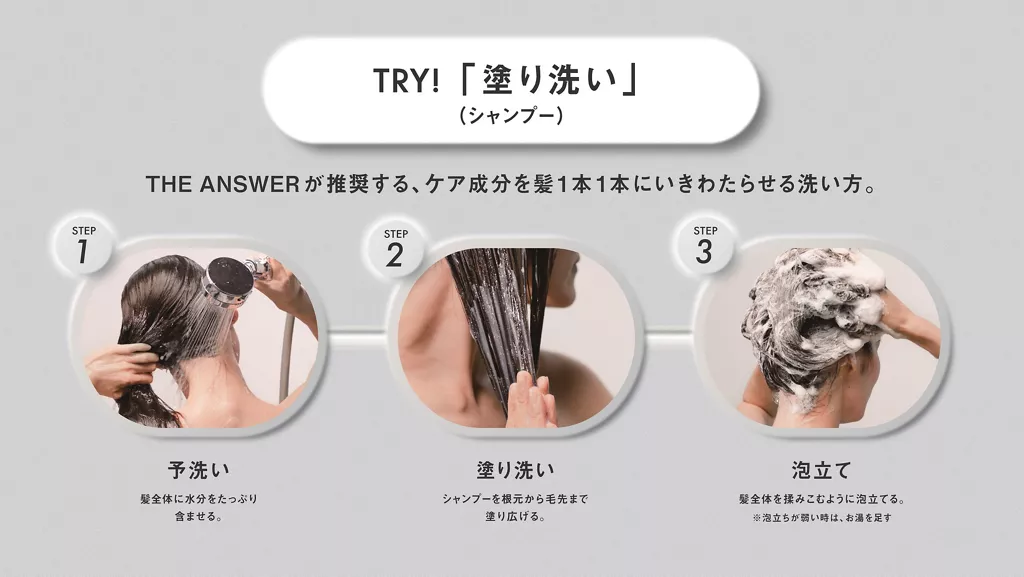 美髪5大必須成分配合シャンプー「THE ANSWER(ジアンサー)」は、構築したラメラ層に、ケア成分を蓄えるラメラプラットフォーム技術を搭載。ケア成分をしっかりと髪の毛に行き渡らせるために、「塗り洗い」を推奨していることも特徴のひとつ。まるで美容液のようなテクスチャーのシャンプーが、髪全体に行き渡り、うるおい、まとまり、ツヤめき、なめらかで、しなやかな美髪へと導いてくれます。